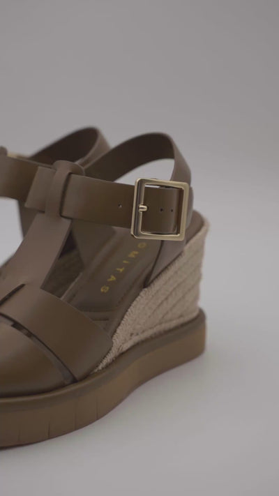 Sandalia en piel 100% con cuña forrada en yute color natural y piso flexible de micro y hebilla metálica