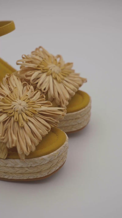 100% suede sandal with buckle closure and natural raffia floral embellishment and natural raffia-covered wedge heel
