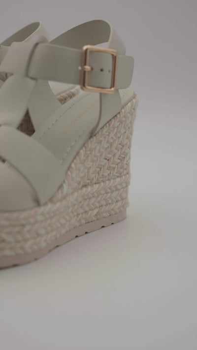 Sandalia cuña en piel 100% con plataforma y cuña forrada en raffia al tono y raffia color natural y hebilla metálica