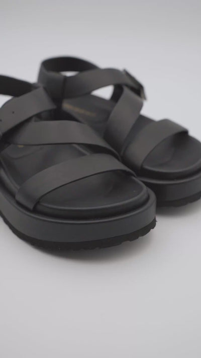 Sandalia 100% piel con tiras cruzadas y cierre de hebilla forrada.