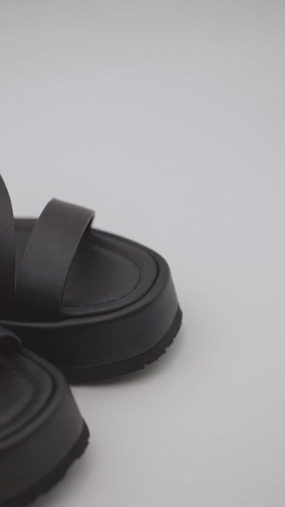 Sandalia cuña en piel 100% con tiras cruzadas y cierre de hebilla forrada.