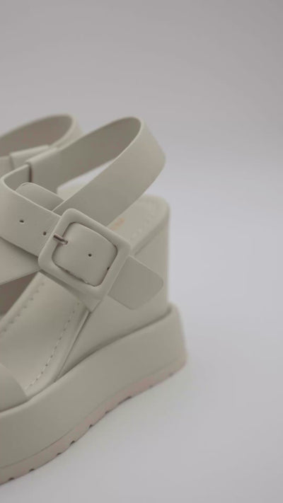 Sandalia cuña en piel 100% con tiras cruzadas y cierre de hebilla forrada.