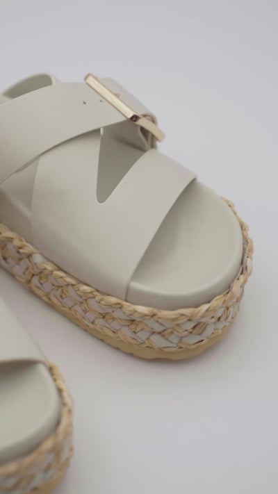 Sandalia en piel 100% con plataforma forrada en raffia trenzada, en dos tonos y hebilla grande metálica