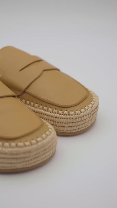 Backless loafer in 100% leather with a sole in hand-woven natural raffia