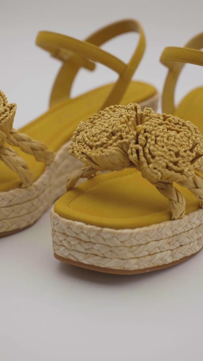 100% suede sandal with buckle closure and matching raffia floral embellishment, raffia-lined wedge