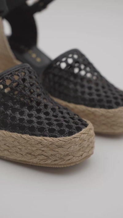 100% raffia macramé sandal with buckle closure, raffia-lined wedge, and mechanical heel
