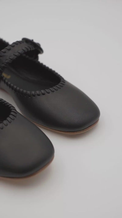 100% leather ballerina flats with matching buckle, delicate piping, and leather sole with non-slip detail on the toe