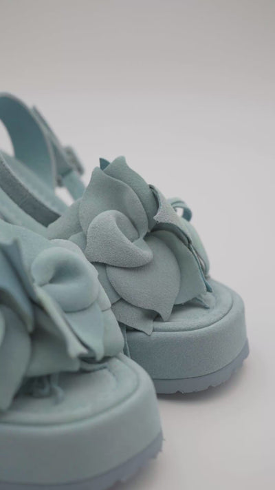 100% suede sandal with matching suede-lined buckle and floral embellishment on the upper, matching-colored platform and wedge