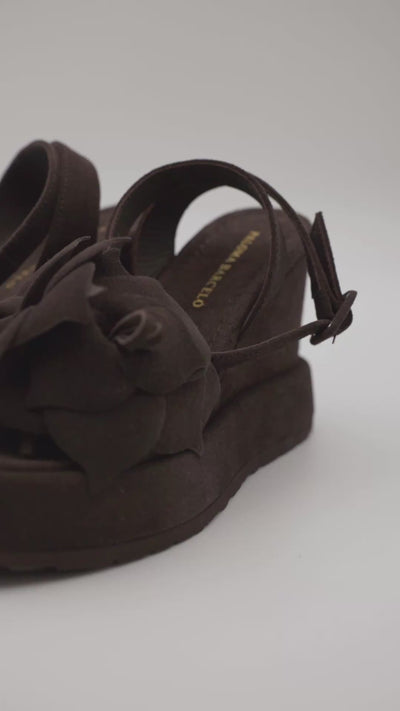 100% suede sandal with matching suede-lined buckle and floral embellishment on the upper, matching platform and wedge